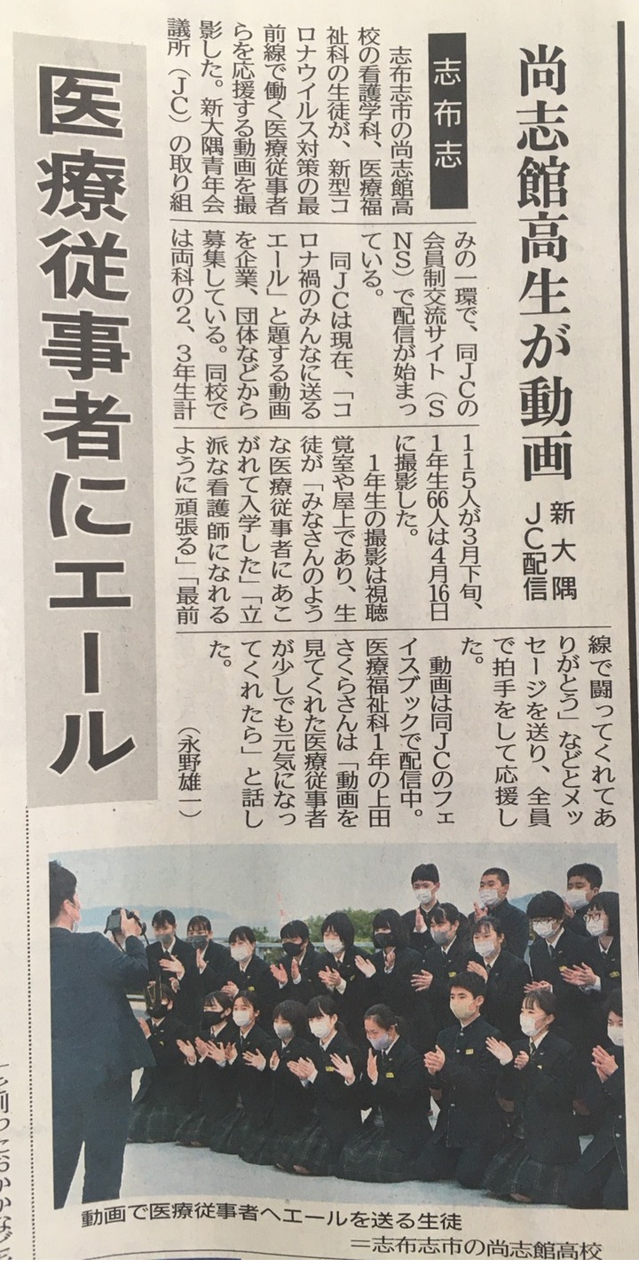 本日の南日本新聞に、本校の医療福祉科、看護学科を中心に医療従事者へ向けた動画を作成した内容の記事が掲載されていました。未だ収まることのないコロナウィルス感染症ですが、医療従事者のみなさまがあっての現在だと思います。本校にも、そんな方々のようになりたいと希望し入学してきた生徒が多数います。少しでも医療従事者の皆様の励みになればと思います。ぜひ、ご覧ください。