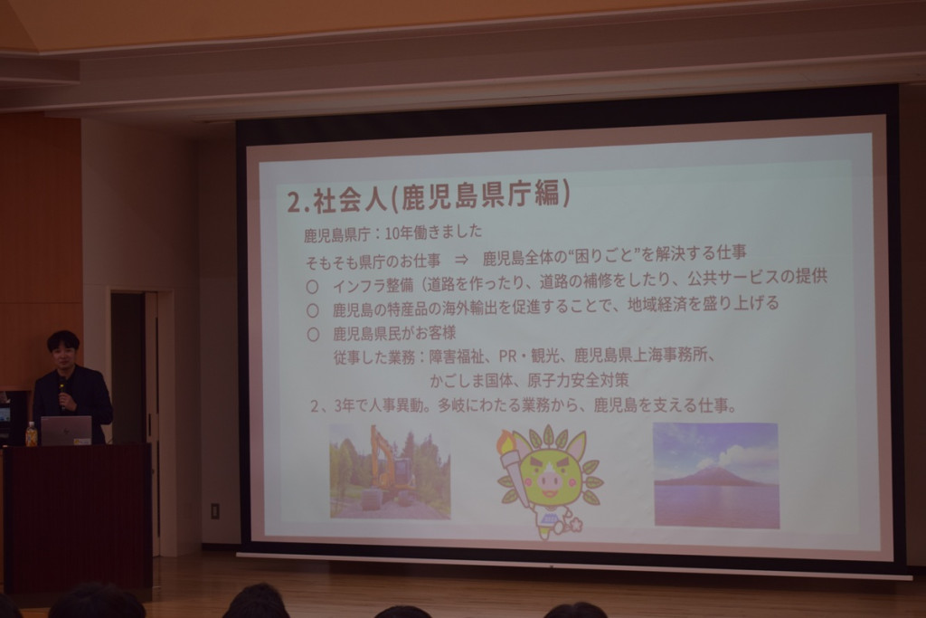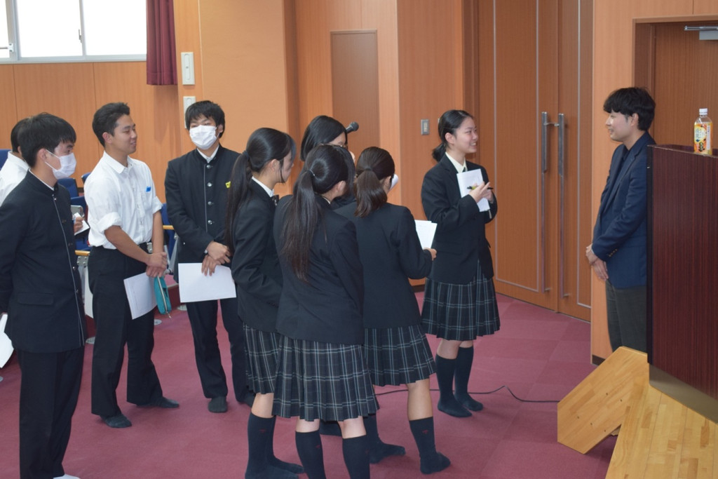社会で活躍されている特進科卒業生による、今年度3回目の出前授業を実施しました。講師は2011年本校特進科卒業の白井航先生。九州大学教育学部を卒業後、鹿児島県庁に入庁。中国で鹿児島焼酎の魅力を紹介するお仕事の経験から、マーケティングやプロモーションにより専門的に関わりたい意欲が芽生え、現在は株式会社現場サポートでご活躍されています。高校から大学、現在まで友人を大切にしているお話や大学で知った英語で議論をする生きた英語の楽しさ、県庁時代に経験した日本と中国とのスピード感の違いなど多岐にわたるお話をいただきました。特に印象的だったのは生徒たちの「高校生のときに大切にしていたことは?」という質問に対する、「宿題の期限を守ること」という答え。高校生だけでなく、社会人にとっても提出物の期限を守ることは信頼を得るうえで一番大事だとお話をされたことで生徒たちも改めて「当たり前のことをきちんと守る」ことの大切さに気付いたようです。白井先生、本日のご講演ありがとうございました。