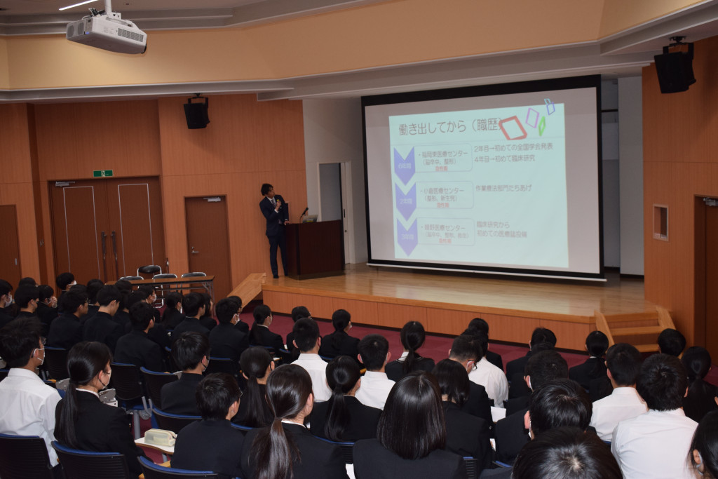 山重先生は作業療法士としての20年のキャリアの中で、臨床経験だけでなく定期的に学会発表も行い、精力的に活躍されています。話の中では作業療法と理学療法の違いや、実際のリハビリ現場ではVR技術やロボットも用いること等をたくさんの写真や映像をもとに、高校生にもわかりやすく教えていただきました。その中でも、「常に患者さんが求めている状態に一日でも早く戻ってほしいと思いながら仕事をしている」と仕事のやりがいについて話されていた言葉が特に印象的でした。さらに、先生の「失敗から学ぶこともたくさんある」という言葉を受けて、生徒たちも失敗を恐れずにチャレンジすることの大切さを改めて感じたようです。