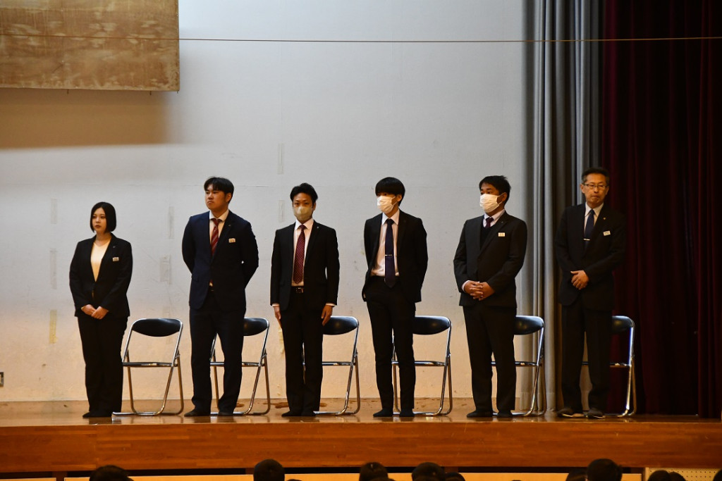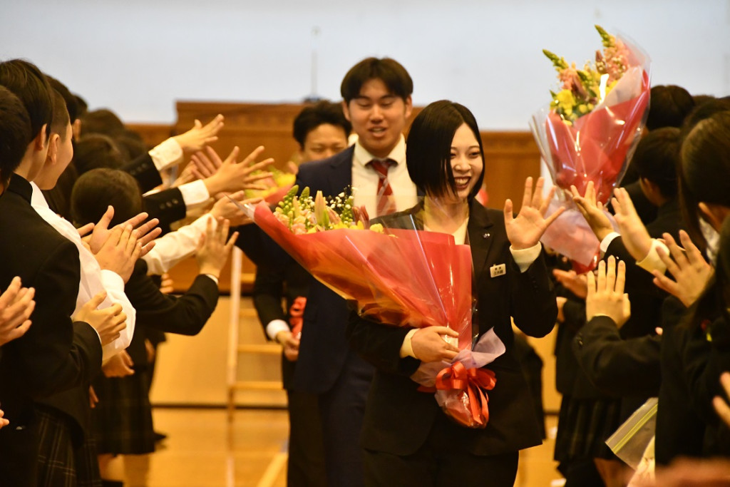 式の最後には、先生方から温かいお言葉をいただき、思わず涙ぐむ姿も見られました。その姿に、生徒たちも胸が熱くなり、別れを惜しむ気持ちが会場全体に広がりました。